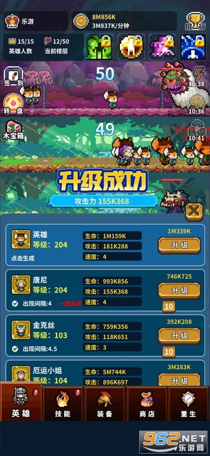 《真男人就上10000层破解版》是一款像素风格的放置养成手游,游戏中玩家可以召唤大量的勇士前往一层层关卡去战斗,每一层都有着一个boss,玩家需要解锁各种强力的英雄,升级强化提高属性,收集神器装备等,闯过更高的层数。