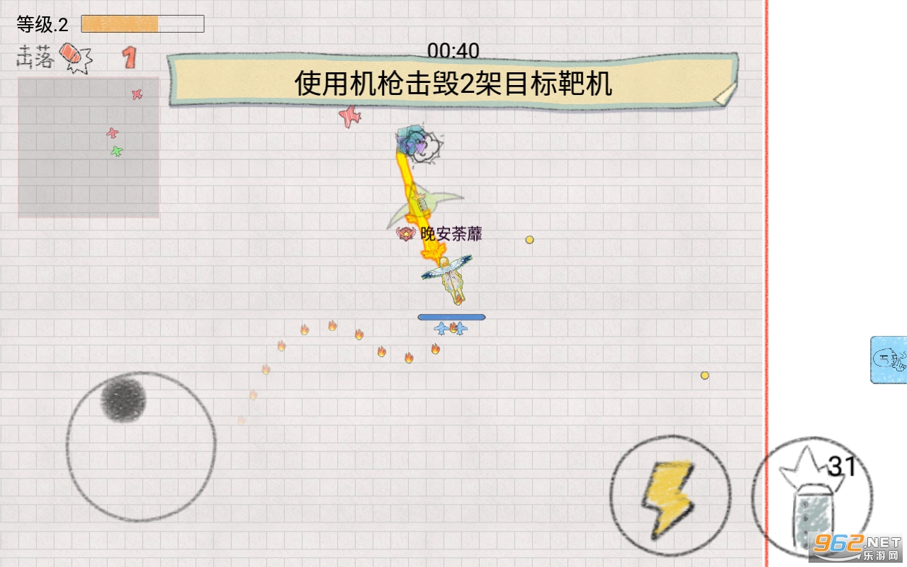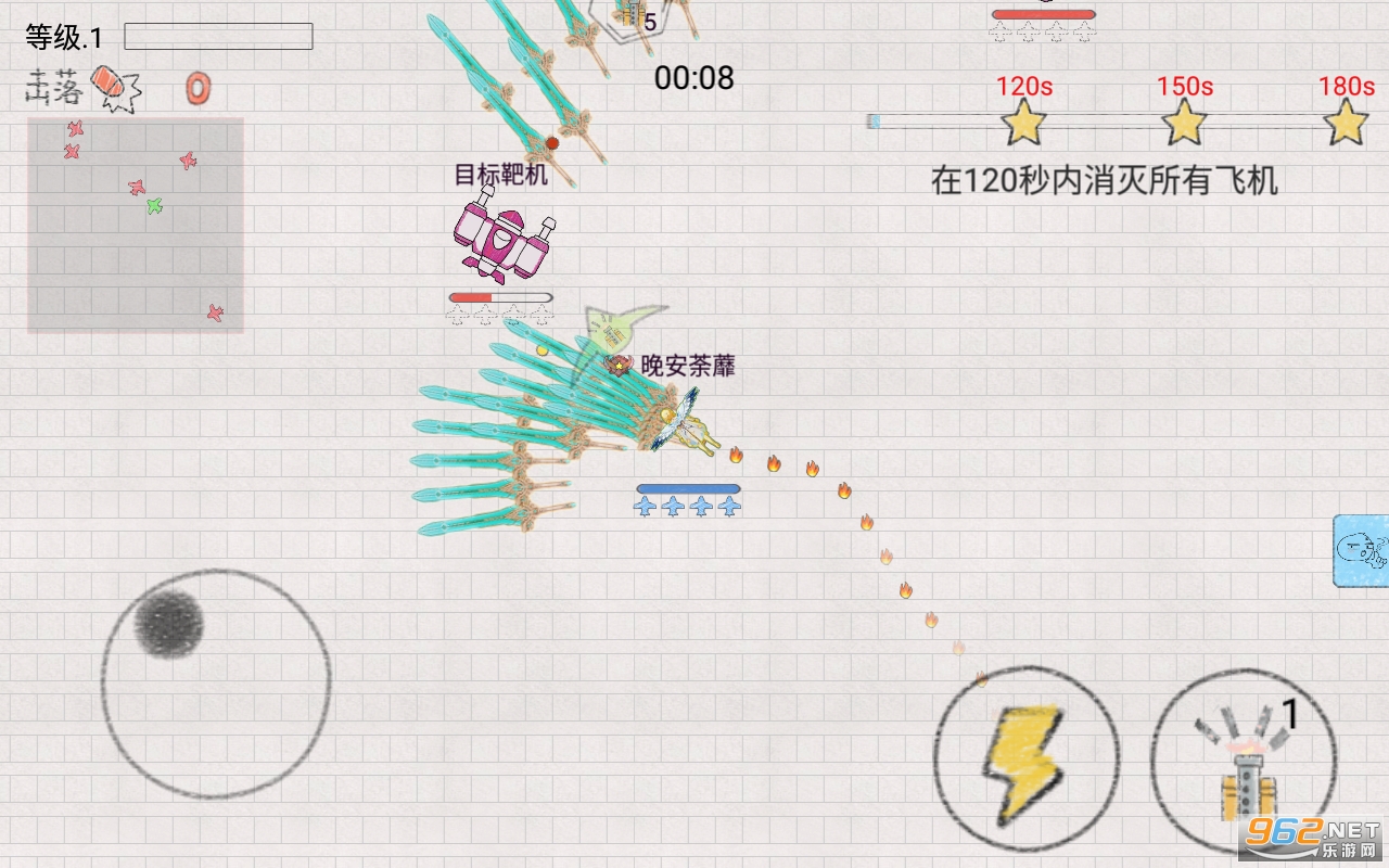2、游戏中还有一招杀人一千自损八百的手法——撞机。一旦采用撞机式攻击,被撞两架飞机就只比拼剩余血量。血量低的飞机直接原地爆炸,而血量高的飞机虽然撞爆对方,自己也会根据比例进行大量扣血。右下角的加速按钮可以对飞机进行短暂加速,为撞机和摆脱追击都提供了操作空间。