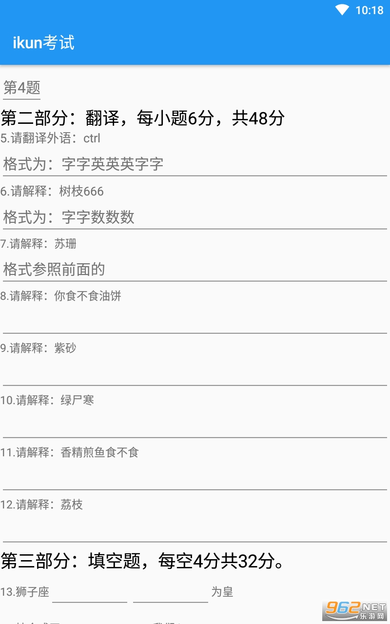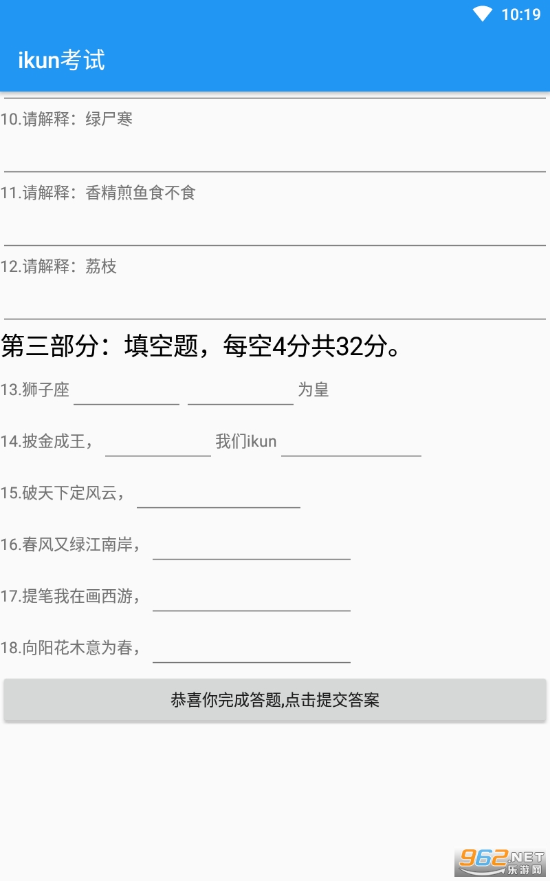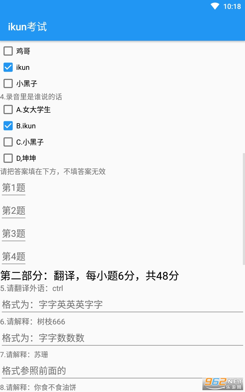 《ikun考试正式版Ⅰ》是一款玩起来非常有趣的测试模拟类游戏,作为ikun浓度测试,都是网上一些比较有名的恶搞的梗以及元素,非常的魔性,答题做的有模有样的,感兴趣的亲们赶紧下载吧。