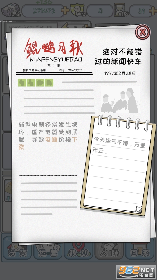 休闲角色扮演游戏,穿越回到97年,通过自己的头脑和运气,体验屌丝逆袭崛起,成为一方首富的有趣时空冒险。