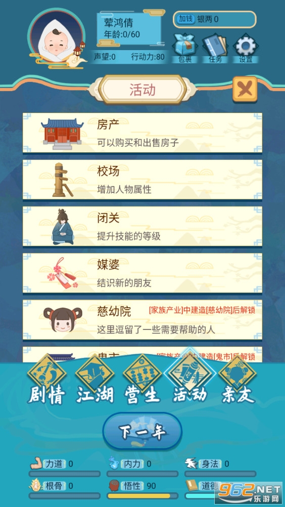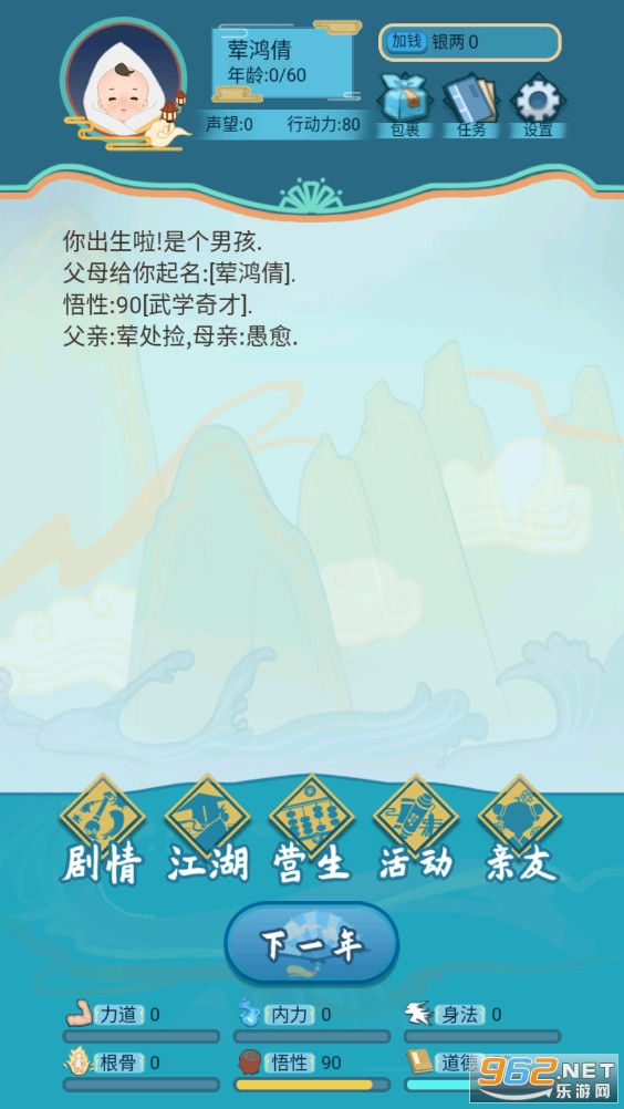 《武侠人生模拟器》是一款有趣的人生模拟系列的武侠版,在这款游戏中你将来到古代开始自己的生活,你有着随机的天赋和出生,在一步步的成长中经历江湖的风风雨雨,游戏的玩法轻松有趣,赶快下载体验吧!