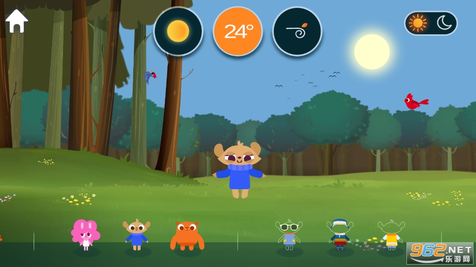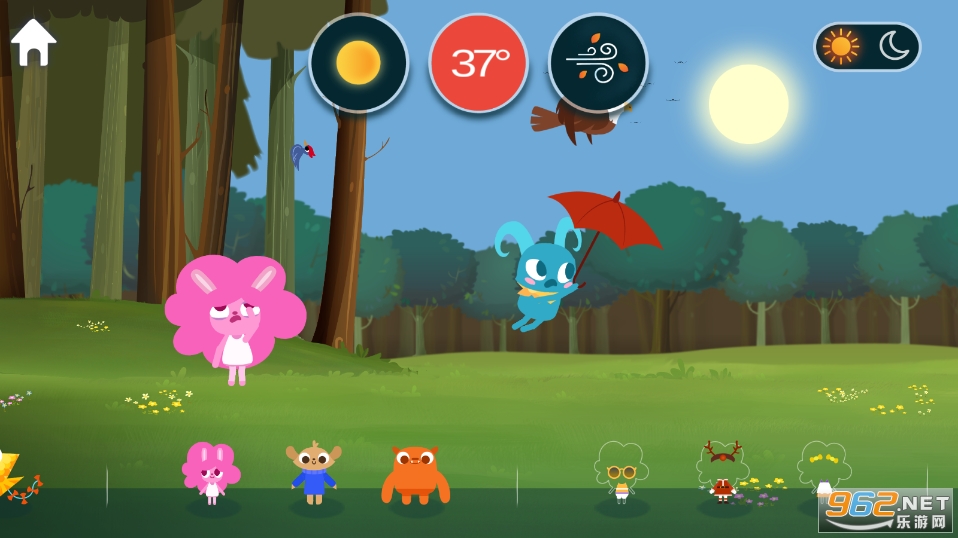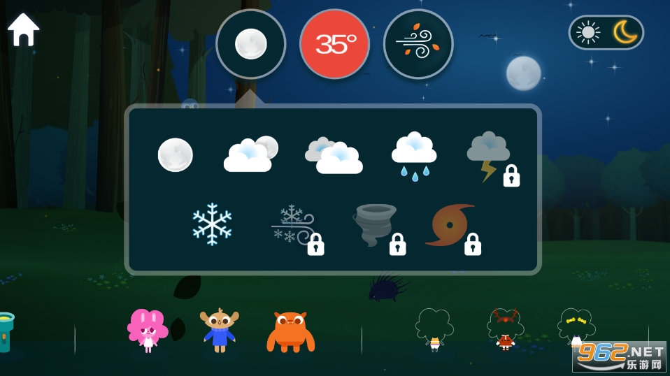专为孩子们打造的一款早教游戏,游戏的玩法比较的简单,自由,拥有非常多的天气状况,可爱的角色可以让孩子们在游戏里面自由的试验,通过游戏来模拟不同的天气情况下,动物的感受,以此来学习生活中关于天气的常识!