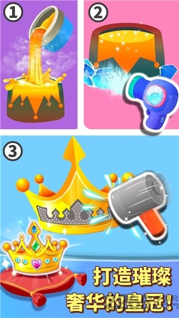 小公主怎么能缺少皇冠呢?将黄金加热浇铸成型,挑选亮闪闪的宝石、五颜六色的珍珠作点缀。皇冠做好了,给公主戴上拍照喽~