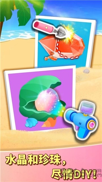 去沙滩寻找贝壳,取出珍珠,染上红的绿的各种颜色,搭配蝴蝶结串成项链。小公主佩戴完成,瞬间闪耀全场,美美哒~
