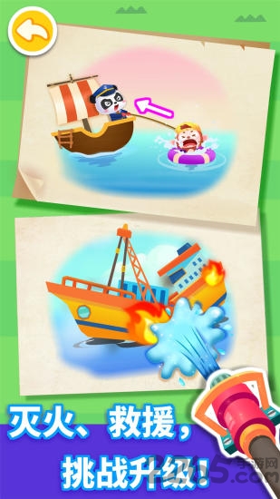 伙伴们掉进水里了,宝宝能帮助它们嘛?扔出救生圈,就能救起它们。看,有船只起火,快使用消防泡沫,扑灭大火。人鱼公主被困,宝宝化身小骑士,剪开海草,解开铁锁,救出公主,宝宝真棒!