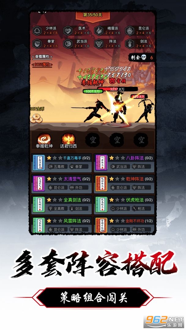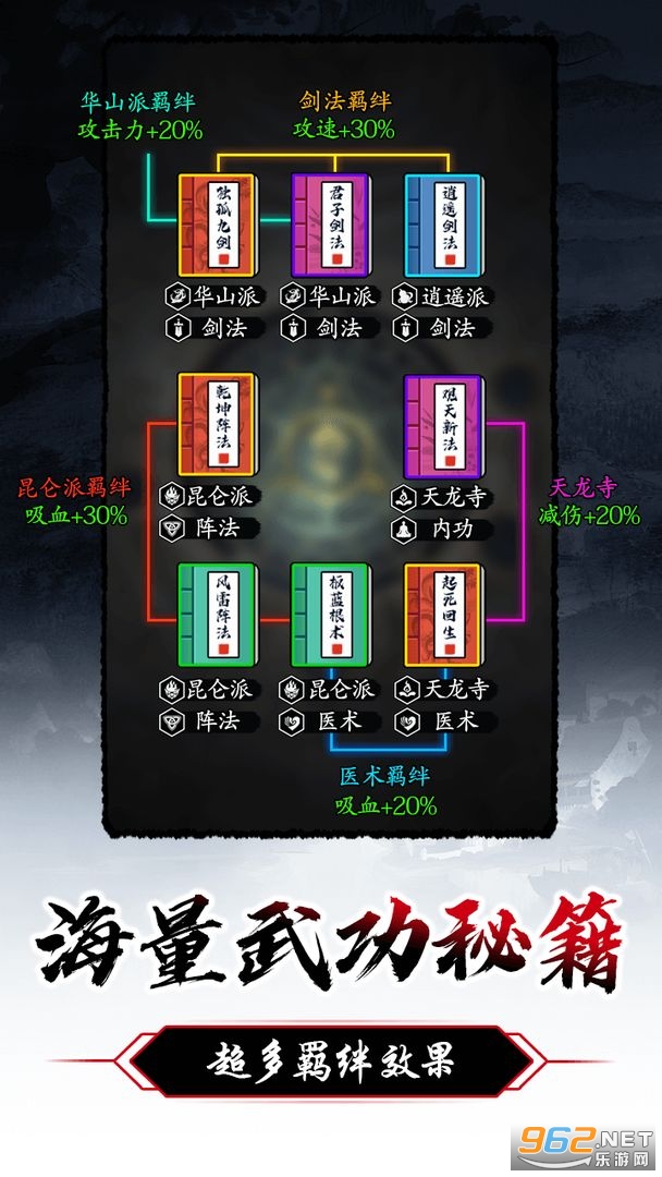 --14种门派羁绊,10种职业羁绊,每种武功升到满星还可激活专有特效,可搭配出多种各具特色的武功阵容。