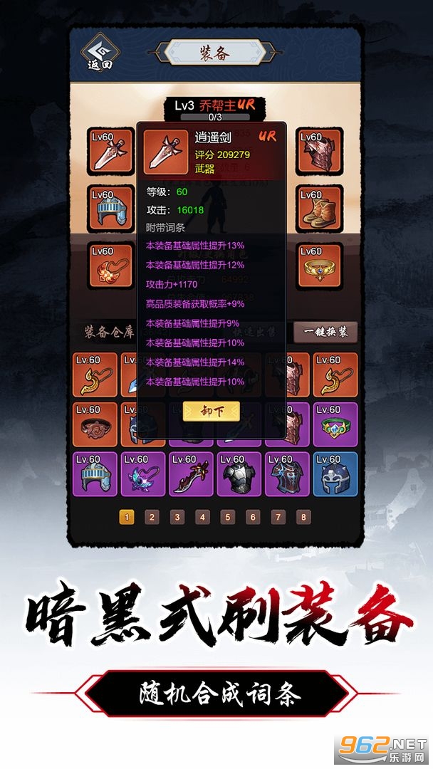 --打怪随机掉装备,几十种不同类型的装备词条效果,支持装备合成。