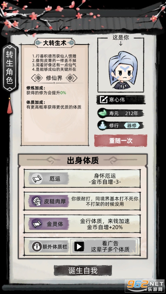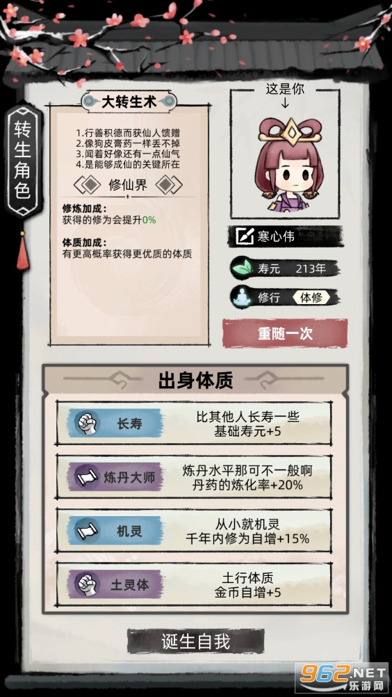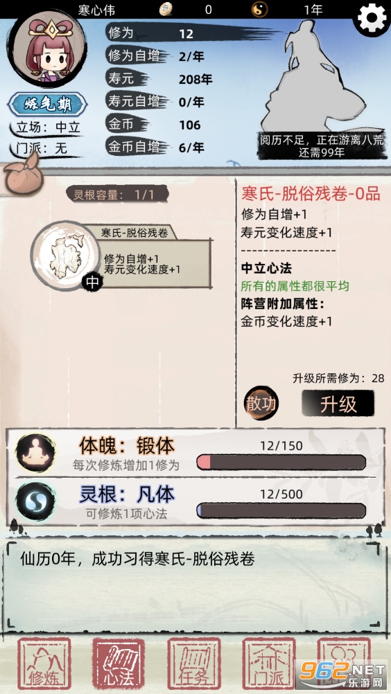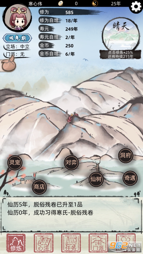 一款轻松有趣的放置修仙模拟游戏,你可以随机你的出生和天赋,然后开始修仙之路,一开始你还需要自创心法来进行修炼,还有着丰富的玩法,不断的提升修为解锁更多的区域,推荐给喜欢修仙游戏的玩家。