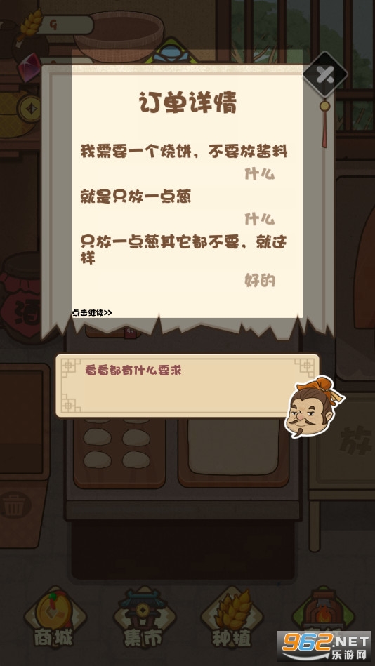 非常有趣的模拟经营类的游戏,玩家在游戏中扮演武大郎制作烧饼进行售卖,不断的完善各种配料,开发出新品,让你的烧饼店越来越好吧!