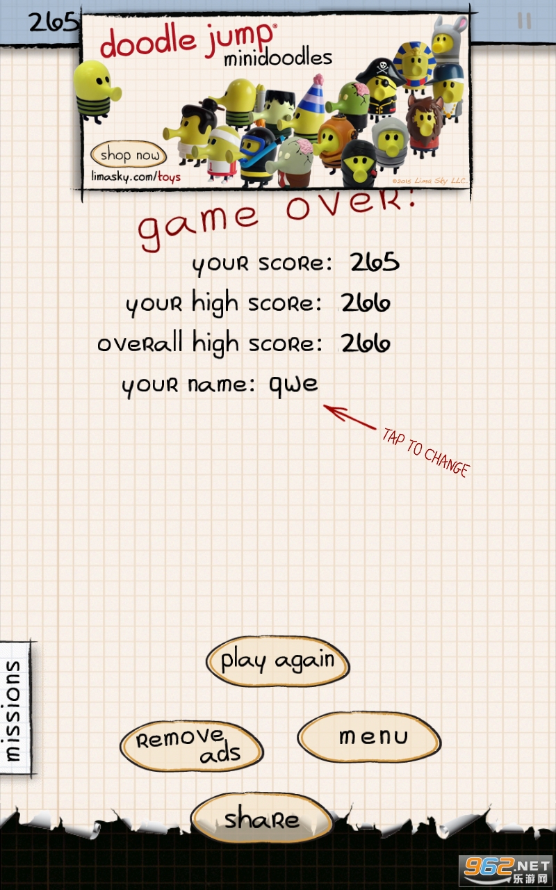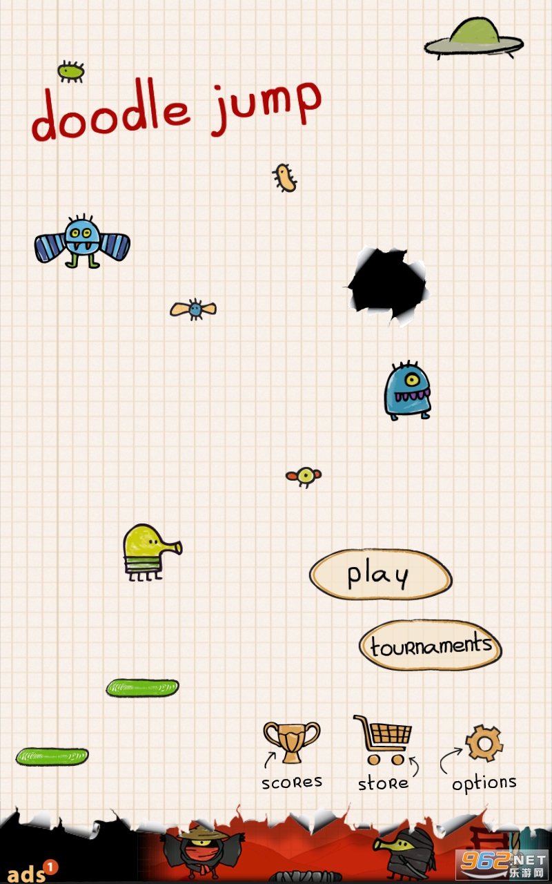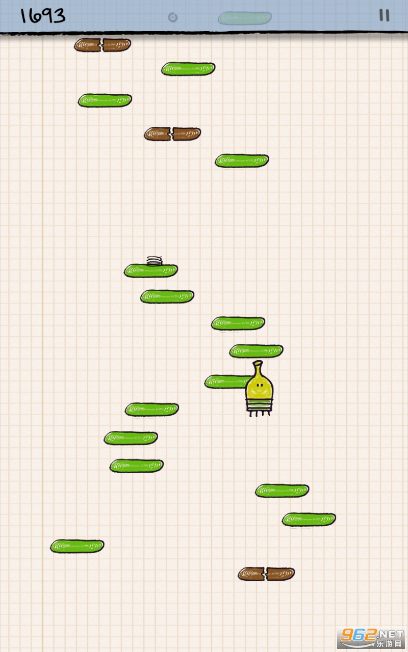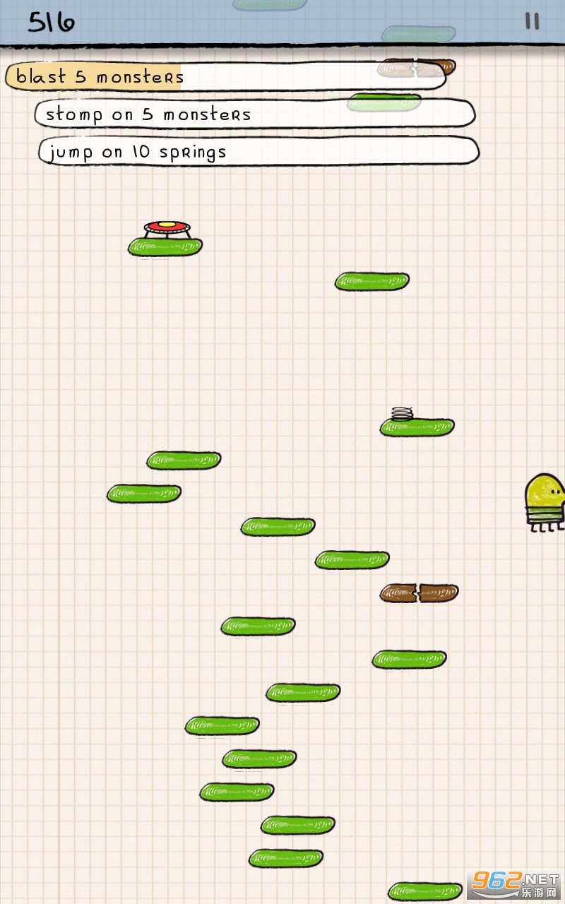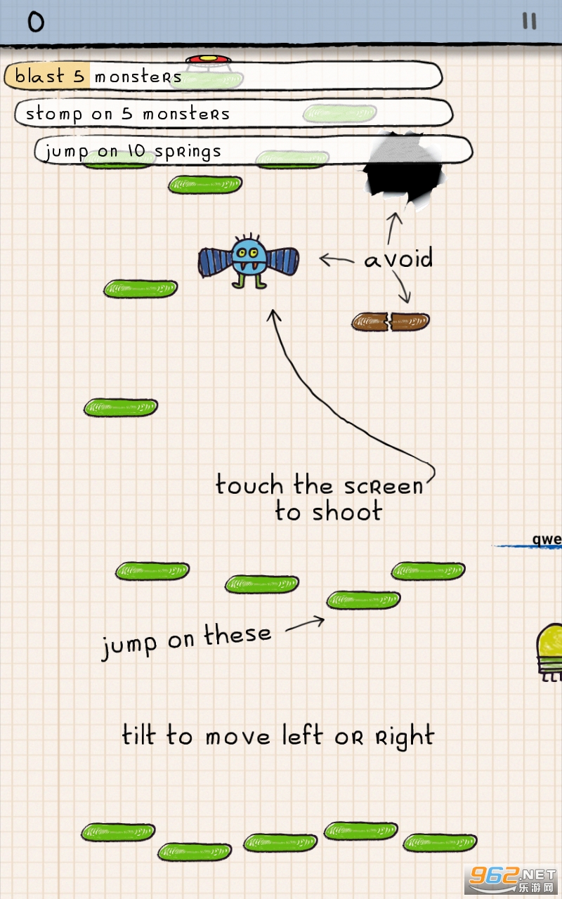 4、在游戏中玩家要让涂鸦弹簧小怪物不停地往上跳跃,在跳跃中要小心破碎的平台、移动的蓝色平台、黑洞、不明飞行物和坏人