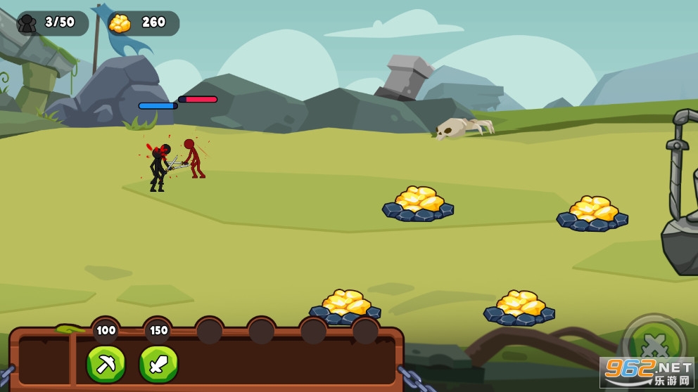 控制你的军队组成编队或指挥单个单位,你拥有每个火柴人的控制权。建造单位,开采黄金,学习剑术、枪矛,训练弓箭手、法师,甚至巨人。摧毁敌人的雕像,占领所有的领土。