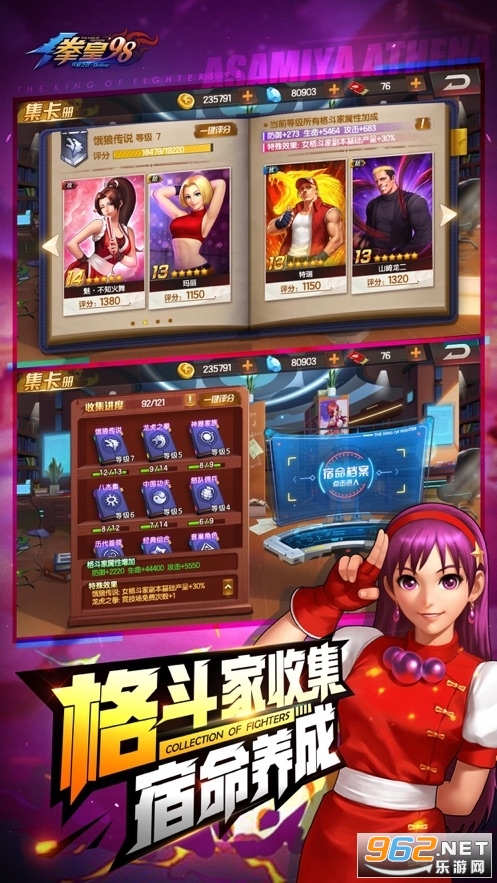 拳皇经典格斗家云集,八神庵、草薙京等最强格斗家们都将为你而战,激活格斗家宿命关系,大幅增强团队战斗力!
