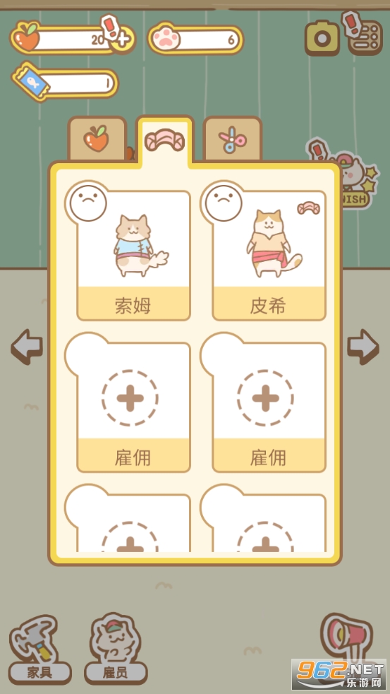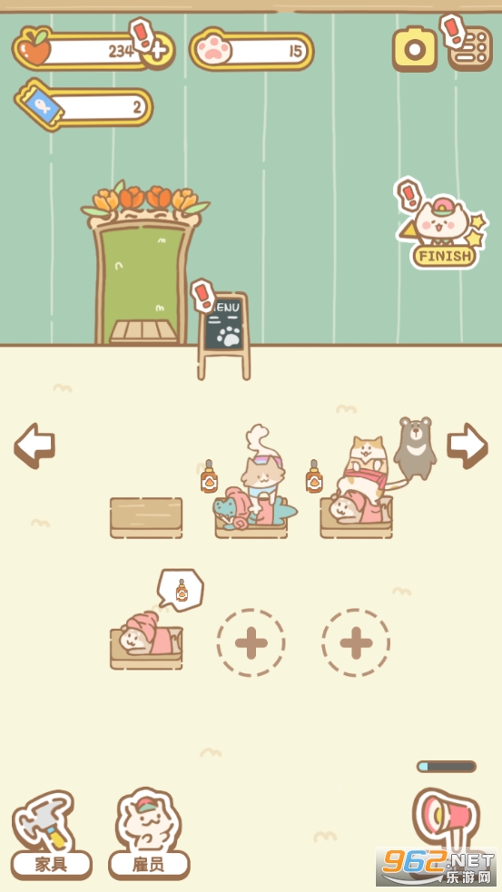 2、你来当老板!雇佣各种各样的猫猫精灵作为员工,迎接蜂拥而来的动物客人。