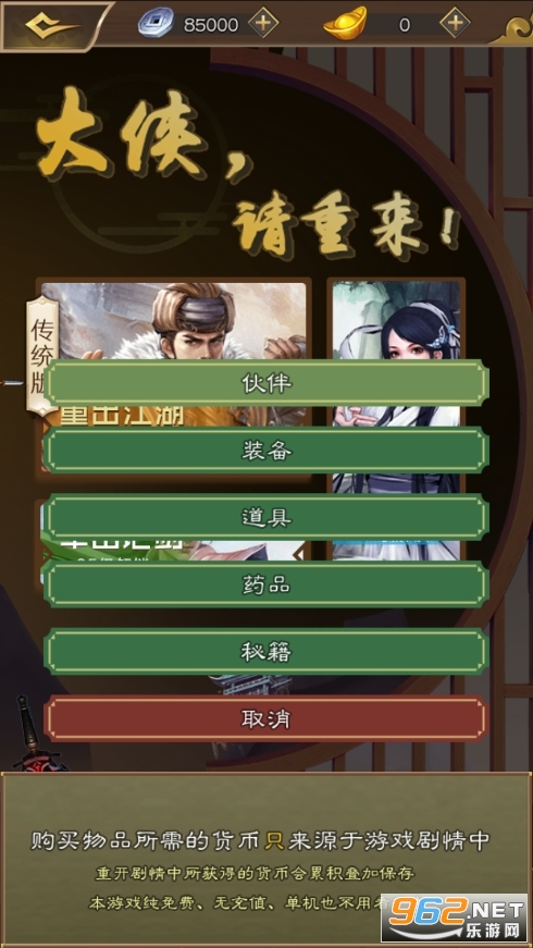 大侠请重来破解版无限银两是一款江湖武侠手游,游戏已经破解成了无限银两,游戏的设计内容剧情丰富,还加入了具体武侠现实生活气息,还原给你一个最为真实的具有武侠特色下的人生经历,在游戏中体验到真实的江湖闯荡生活,感受江湖中的快意恩仇,随时随地探索江湖结交朋友。