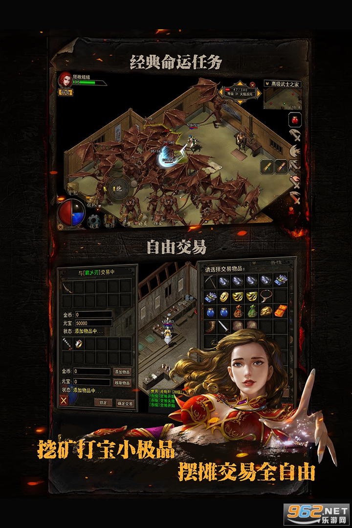 这是一款“以怀旧2002年左右的网游玩法”作为核心体验的手机网游。 游戏设计无任务、无VIP、无强化、无升星等,在设计上拒绝所有无脑点击和无脑氪金的玩法。 游戏设计以普通散人玩家乐趣作为核心,乐趣点有:自由摆摊、自由交易、挖矿、打宝、小极品装备、散人偷猎BOSS、烧猪烧蜈蚣、野外招宝宝、隐藏属性等等。 在战斗平衡性设计上拒绝RMB碾压一切,保证小型PK靠走位、大型攻城靠指挥。