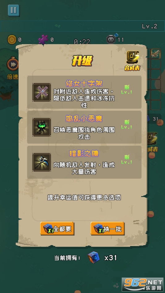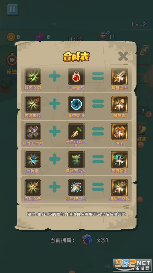 一款轻松有趣的肉鸽游戏,在这款游戏中你将合成各种各样的神器来大杀四方,游戏的操作简单容易上手,你还可以合成各种各样的神器,游戏的关卡丰富有趣,推荐给喜欢休闲生存游戏的玩家。