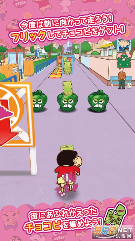 这是一场跑步游戏,其中在春日部市冲刺的Shin-chan上下,左右操作,以获取各种她喜欢的巧克力,同时避免各种障碍。