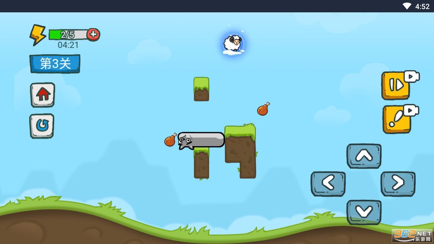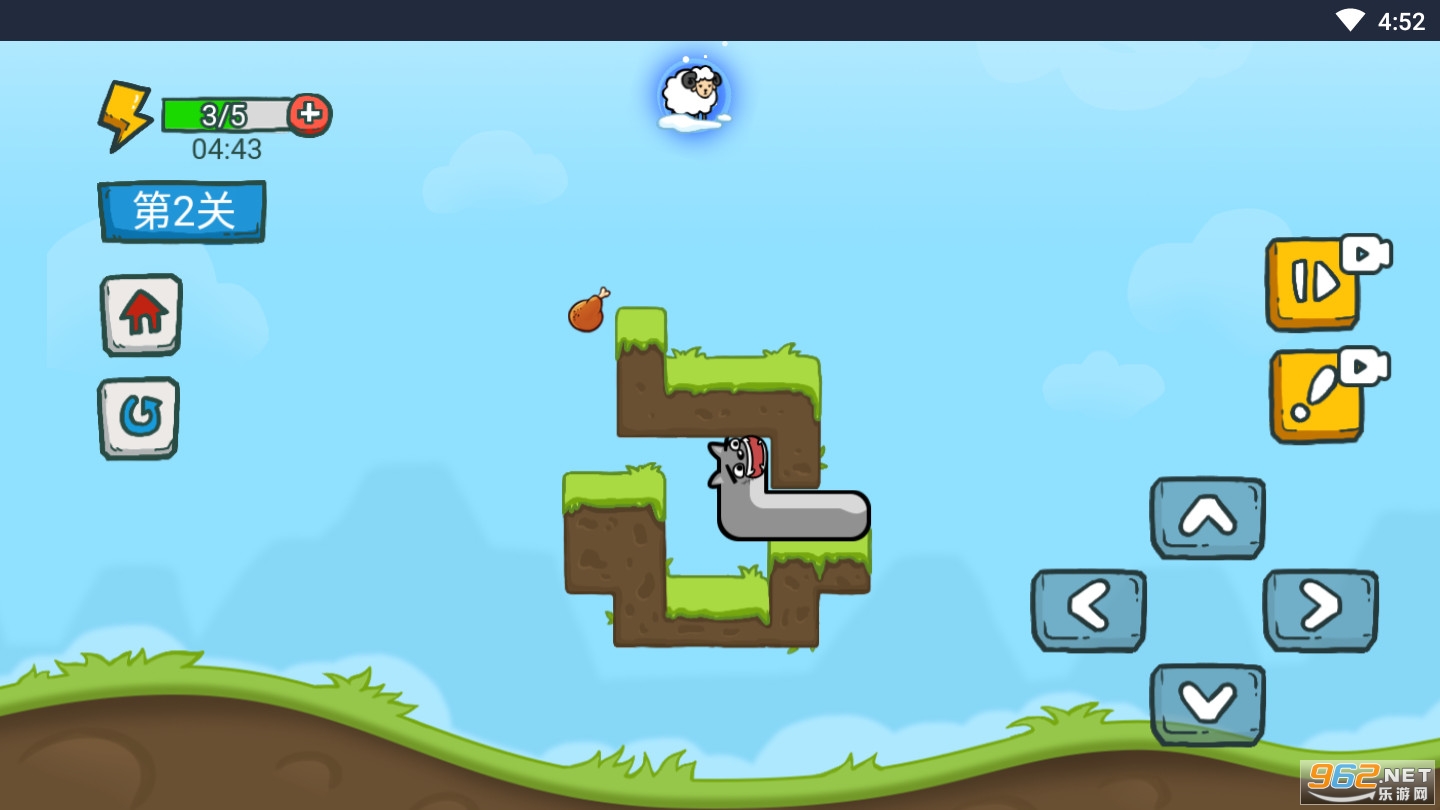 贪吃蛇的另类玩法,不再是一直的吃东西,而是要越过各种陷阱和障碍达到其中的大门,通往下一个关卡的大门,将会带来非常困难的控制体验,贪吃蛇的身体是可以进行折叠的样子,非常的独特。通过上下左右操作来控制狼,吃掉鸡腿会增长一个身体,玩家需要灵活的运用图中的鸡腿,石头等道具来过关。