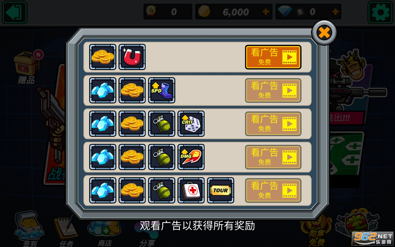 不用看广告获得奖励,大量货币获取或使用一次即可获得