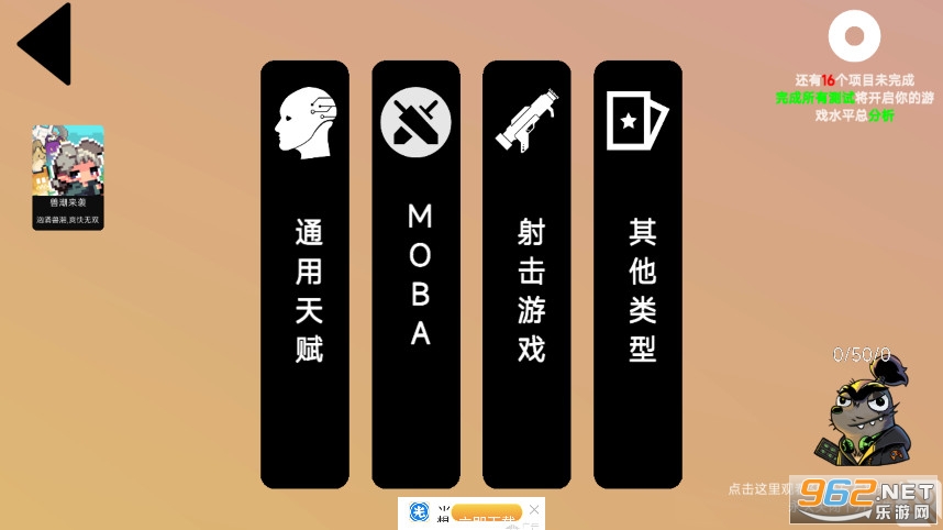 《我的游戏天赋》是搁浅工作室打造的测试小游戏系列第三弹,也叫《我的电竞天赋》,大家目前接触的游戏类型大多数是moba、枪战、弹幕射击、横版跳跃或是音乐类游戏,每个游戏玩家都有自己擅长的方面,这是一款简单的小测试游戏,选择你所正在接触和进行游戏来进行简单的测试评定,看你是真真的技术大神,还是菜鸟入门!