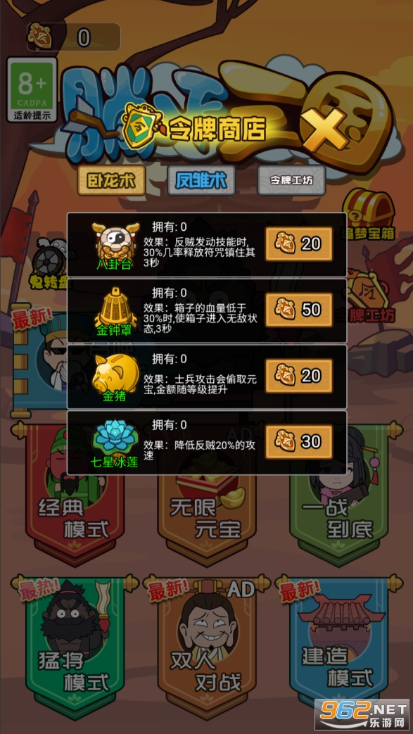 《躺平三国》是一款放置类趣味休闲小游戏,游戏拥有经典模式,召唤卧龙,无限元宝,一站到底,猛将模式,双人对战,建造模式击中不同的玩法模式,每种游戏都是不同的玩法,让你可以在一款游戏里面体验当前最火的《躺平发育》、《召唤神龙》等游戏的玩法,趣味十足~