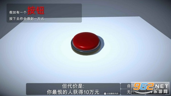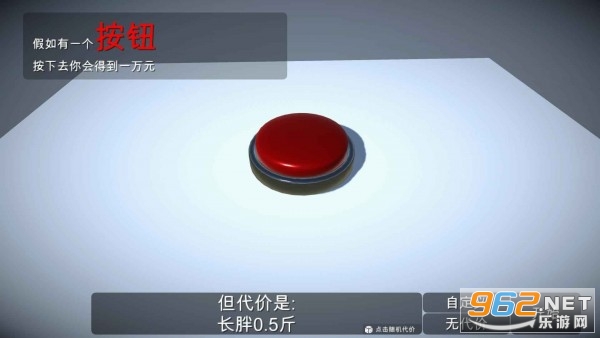 这是一个充满想象力的游戏,很多时候我们都在设想,有一个按钮,按一下可以获得钱,但是会失去一些东西,在这个如果有一个按钮游戏游戏中真的有这样一个按钮,按一下可以获得一万美元。如果有一个按钮游戏满足大家的心里,这个游戏中只有一个按钮,按一下会得到一万美元,但是你不知道会发生什么,可能会变矮,或者生病,或者减寿命,那么这个按钮你会按吗。