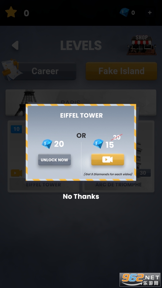 由于成功拆除;你从世界城市的市长那里得到合同。每一位新的 10 星都会带来一份新合同,以拆除假岛的“假地标”。如果您不想等待获得足够的星星来播放地标,您可以使用钻石解锁它们并立即播放。