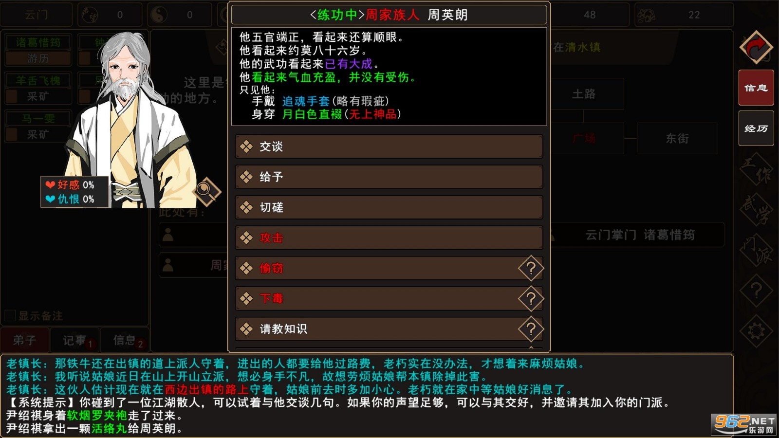 与不同的江湖角色进行交互,你可以向别人打听隐秘的江湖消息,也可以击杀看不顺眼的角色,随意窃取他人身上的财物,但是务必小心官府!