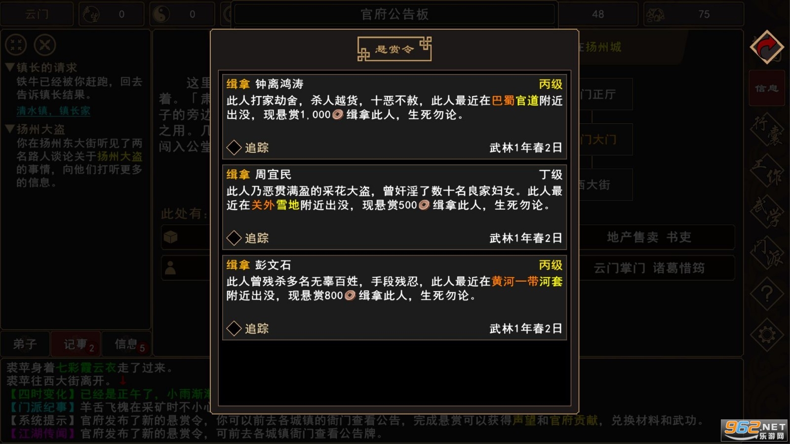 游戏中提供了大量的随机任务,包括官府悬赏令,江湖传闻等。