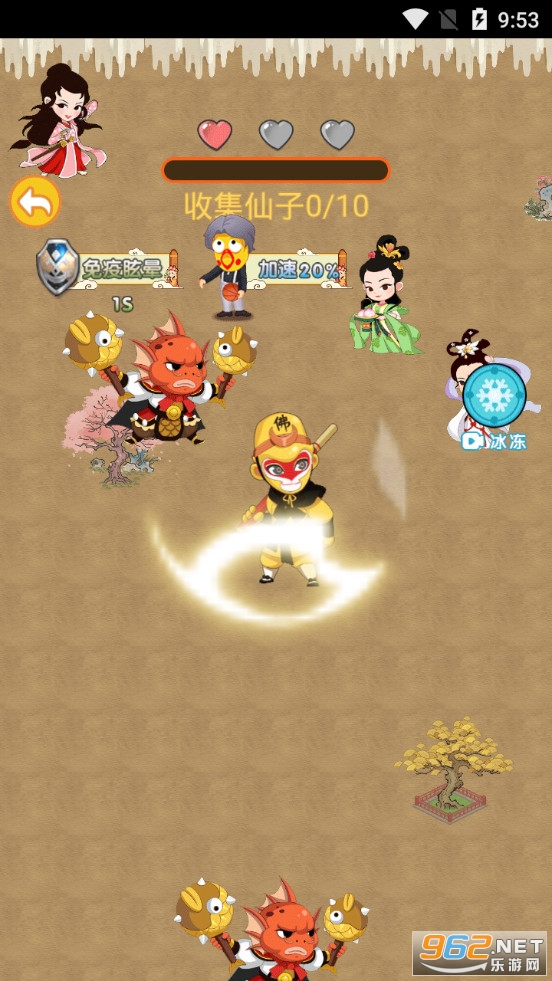 在最开始的时候,你的游戏角色就是猪八戒,操作方法也很简单,只需要手指按着屏幕,控制猪八戒的游走方向就可以。