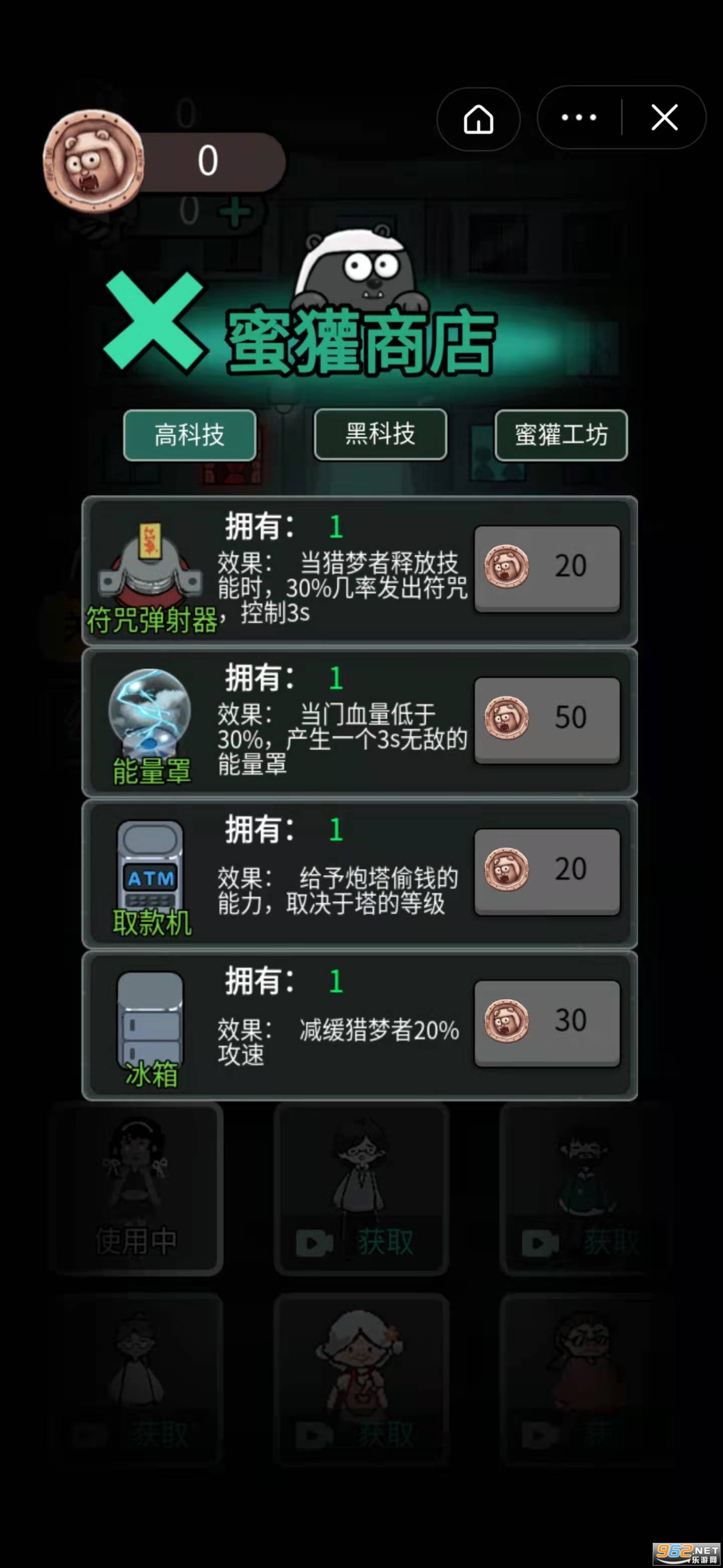 4、蜜獾商店:玩家在每次结束游戏的时候都可以获得一定的蜜獾币,点击右上角的蜜獾商店,在里面不断升级自己的属性,这样可以让玩家在下次游戏的时候可以获得额外的攻击以及防御属性,这样就可以轻松面对猛鬼的攻击了。
