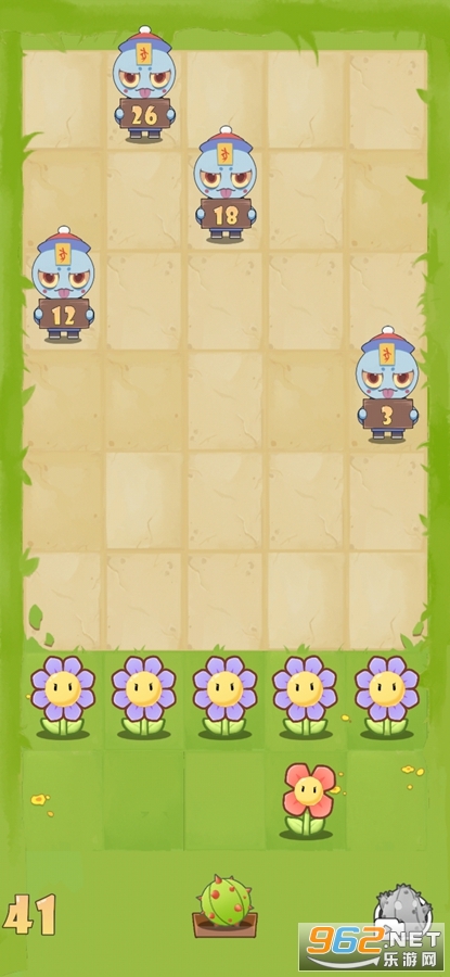 《花花僵尸安卓版》是一款趣味的合成塔防类休闲手游,由召唤神龙、合成大西瓜的厂商微伞小游戏制作,采用的回合制玩法,可以拖动、互换、合成、移出花盆,每个动作都是一个回合,僵尸在五个回合会到达最底部,在僵尸到达前消灭僵尸即可。