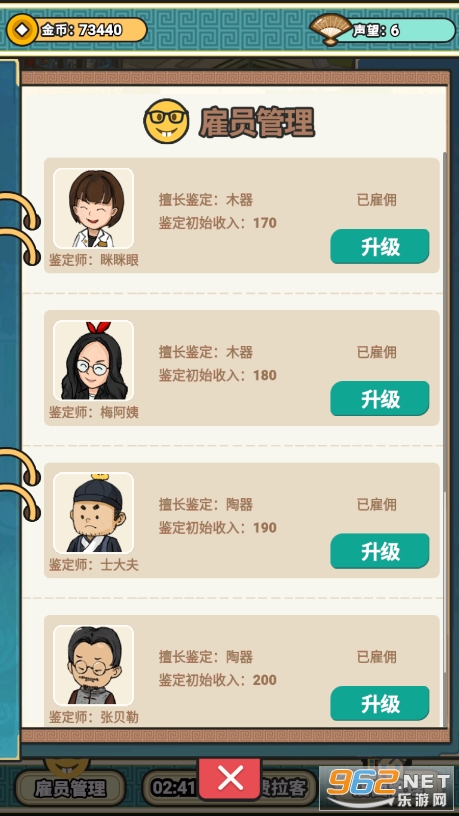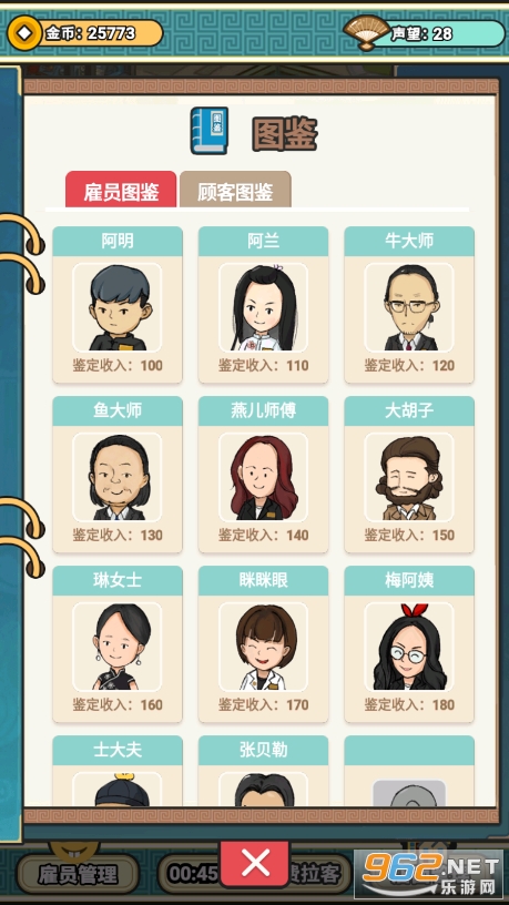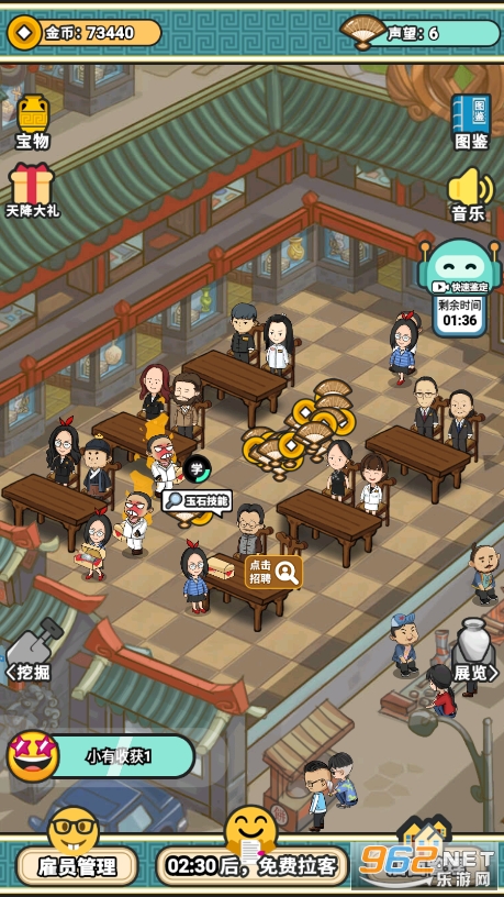 《宝友你别急游戏》是一款古董店模拟经营游戏,玩家扮演老板,可以不断地雇佣店员,招揽顾客,来自己的古董店里面当宝贝,赚差价升级员工,店铺,把你的古董店发扬光大,还可以解锁不同的员工图鉴和顾客图鉴,达成各种成就,玩法轻松,快来下载吧!