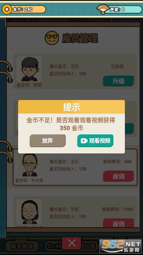 在这里,玩家需要发布广告来吸引更多的宝物持有人,还需要招聘各能力不同的鉴定员工来服务这些顾客,当玩家积累金币达到一定数量后,可以扩大经营业务,进行宝物发掘工作,并开办展览。