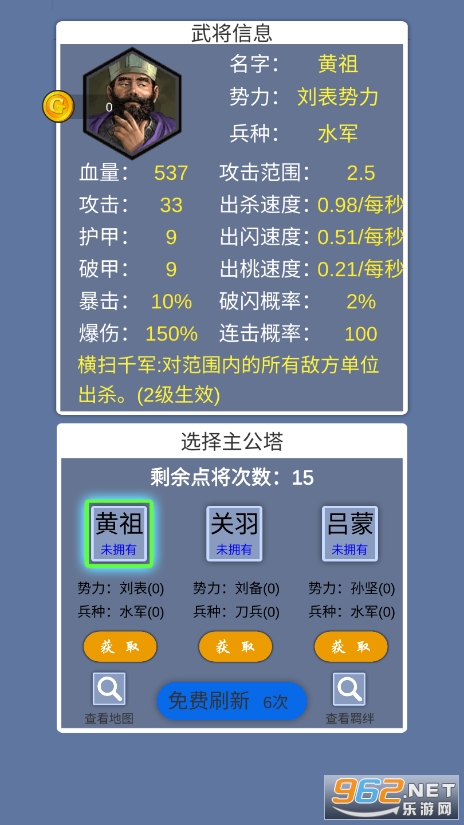 所有关卡都可以游玩,初始武将可以选择15个。不用看广告获得奖励
