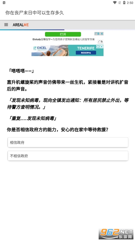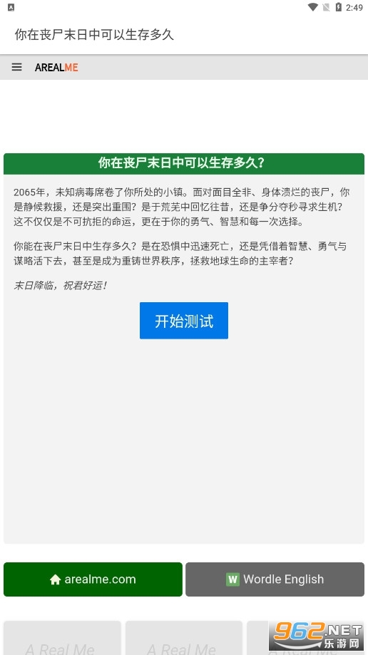最近很火的一款小测试类的游戏,玩家在游戏中通过文字选择的方式来对目前发生的事情根据你的第一印象进行选择,看看你到底能够在末日生存几天,感兴趣的话就快来看看吧!
