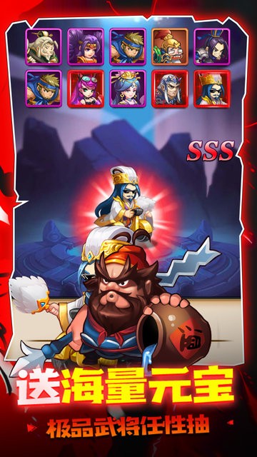 回合制对战,解放双手,释放大脑,武将克制,布置阵法,合体绝技,动感特效,轻轻一点,扫平对面满血小兵;