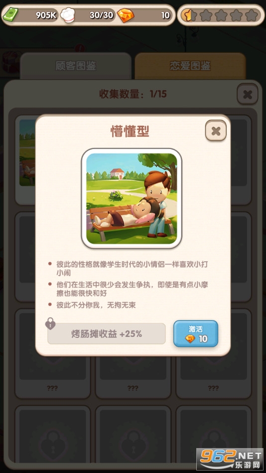 休闲性很强的一款模拟经营游戏,玩家在游戏中需要经营好这家情侣餐厅,不断的对餐厅中的设备进行升级,解锁更多的顾客,并且尽量让他们相亲生成,完成你的爱情插画图鉴吧!