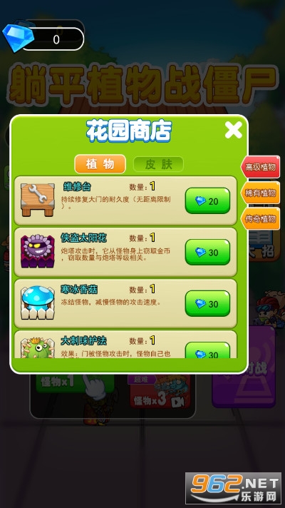 3、植物商店:游戏内有许多大有用处的道具存放于植物商店中,玩家每次游戏后都会获得一些植物币,用这些植物币购买,能够获得该道具的效果并保存至下一局。