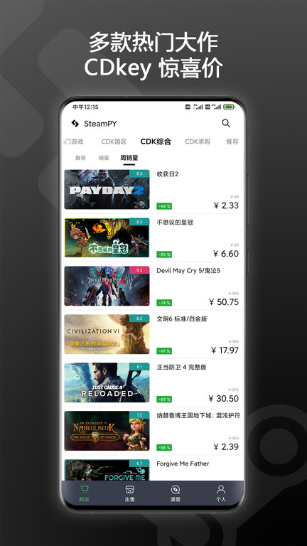 百万Steam玩家的游戏交易平台。旨在提供安全、快捷、可信的游戏交易体验。还可以查看Steam代购额度,出售Steam账户余额,出售CDKey等。交易自动化,避免交易摩擦。在这里你可以超低价购买游戏,超低折扣购买游戏CDkey,还有安全可靠的Steam充值卡等全方面低价购买体验。除此之外,在app充值游戏也很划算,优惠力度都很大,喜欢的朋友快来试试看吧!