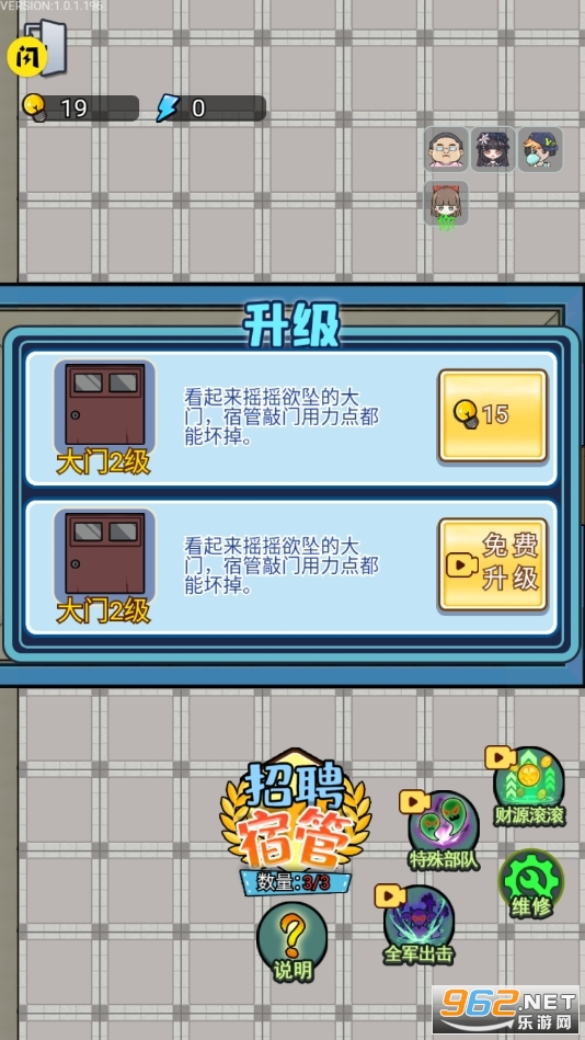 在宿舍里面,你要防备宿管的入侵,升级你的床和大门,好好的躺平。