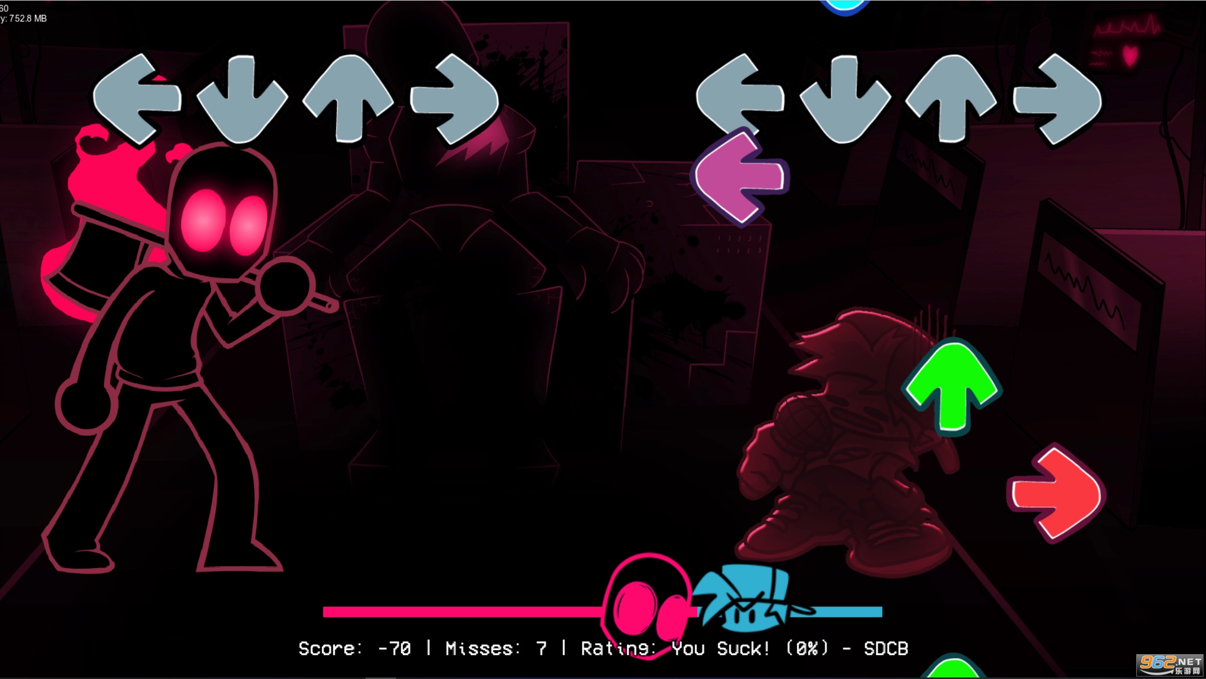 《周五夜放克杀手的天堂模组游戏》游戏中的主角与fnf模组瘦长鬼影非常的相似,不过鬼影mod模组中是以闪回的方式呈现的,而这次的杀手是全程以红色背景“死神收割”的形象展现,并且加入了一些比较恐怖的背景音效在其中。
