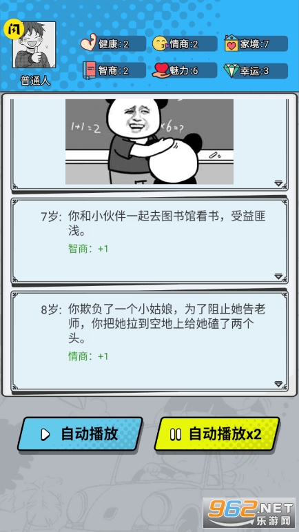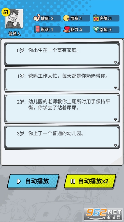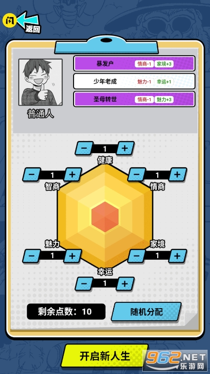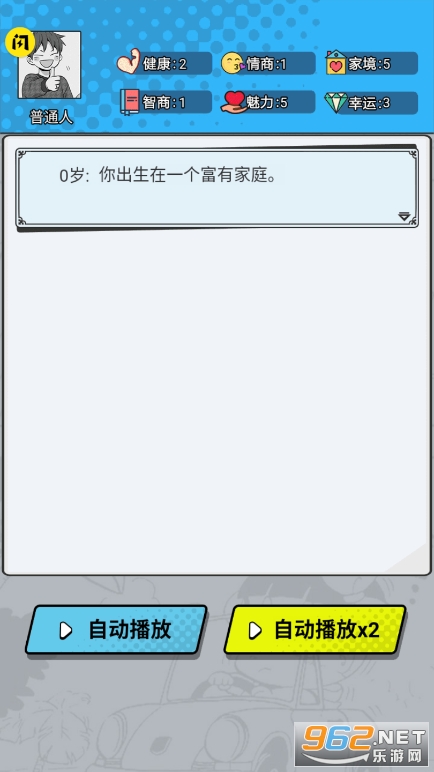 《我的人生重开游戏》是一款全新人生模拟游戏,玩家在游戏开始因为意外车祸,重新轮回转生,你可以选择普通人,富二代,电竞高手,海王,猫,明星,欧皇,商业巨头,歪嘴龙王九种不同人生重来,选择你的天赋,对健康,智商,情商,魅力,家境,幸运等方面分配属性值,不同的选择和分配方式将决定你的经历!