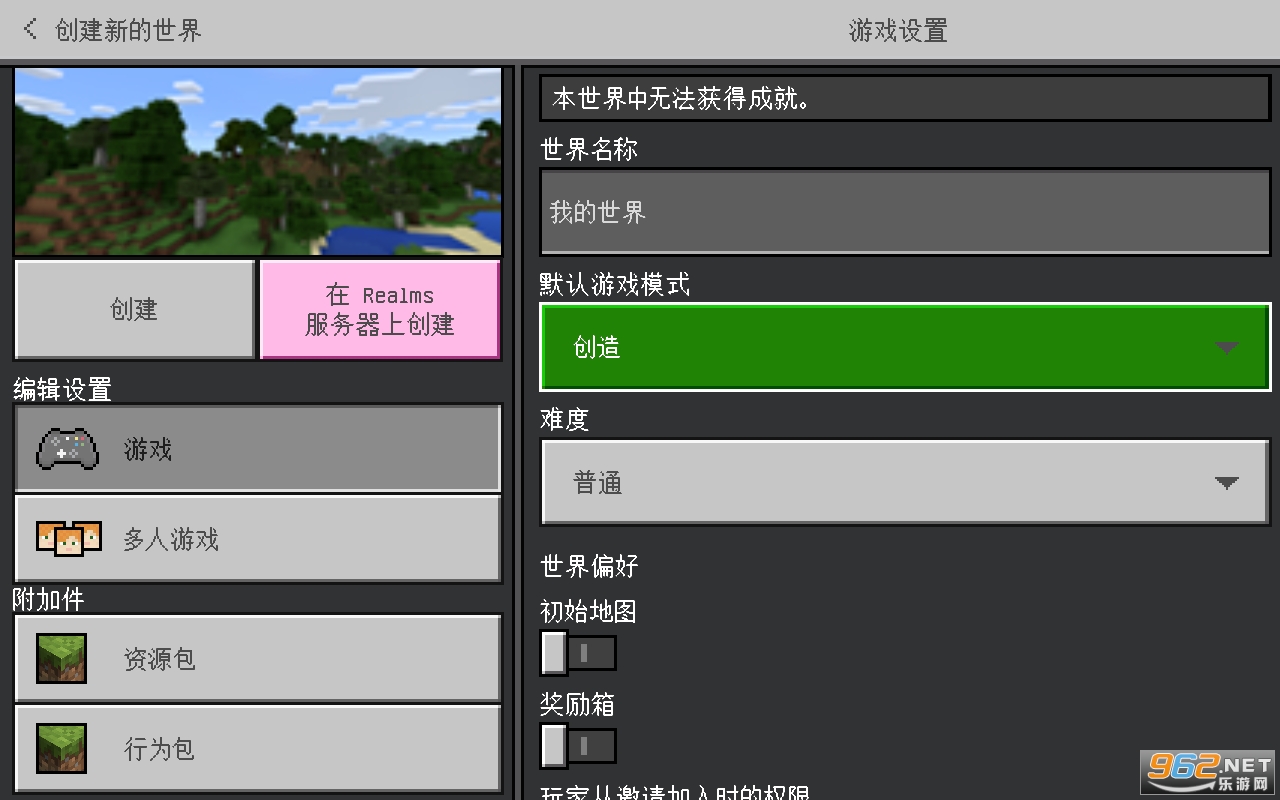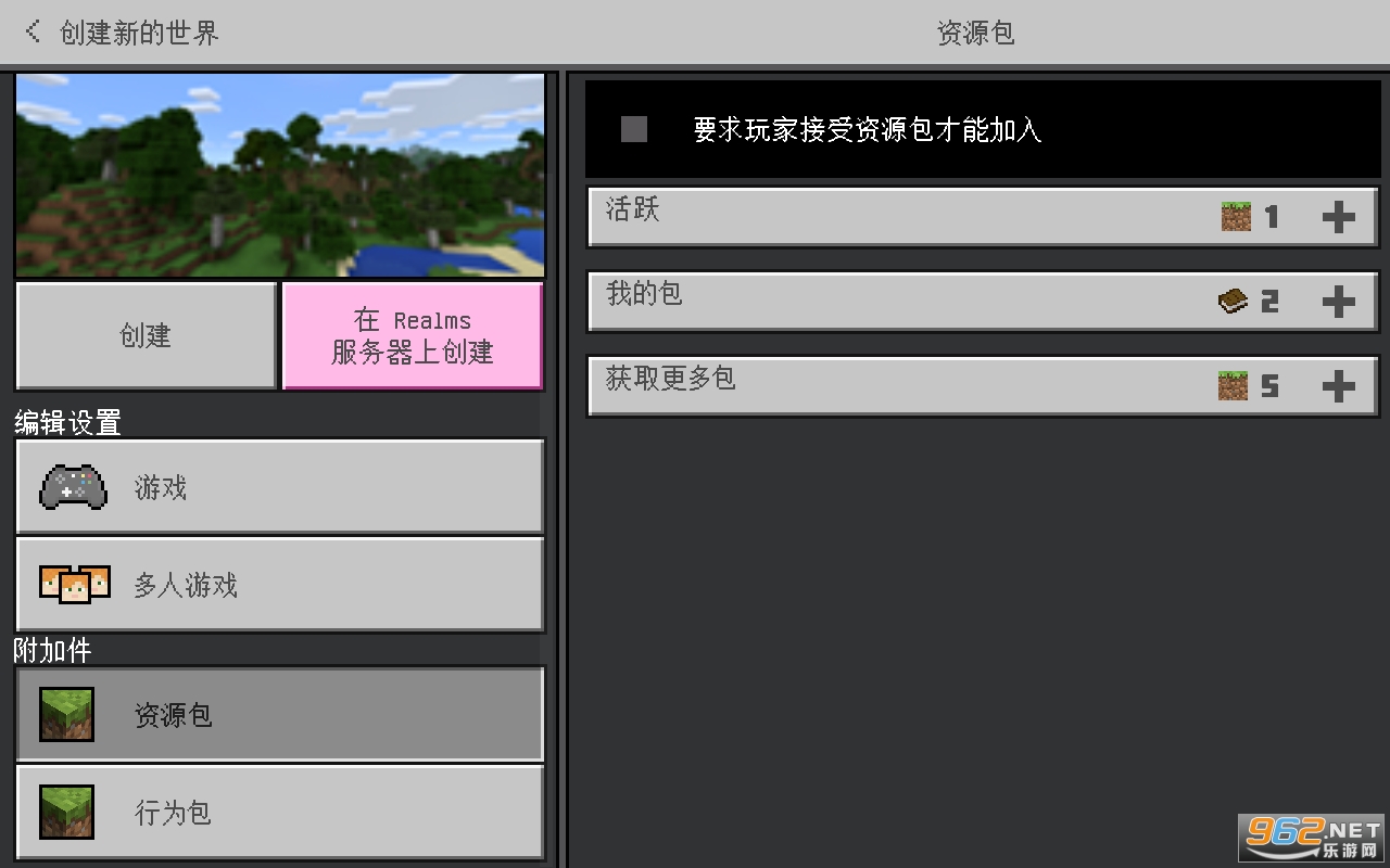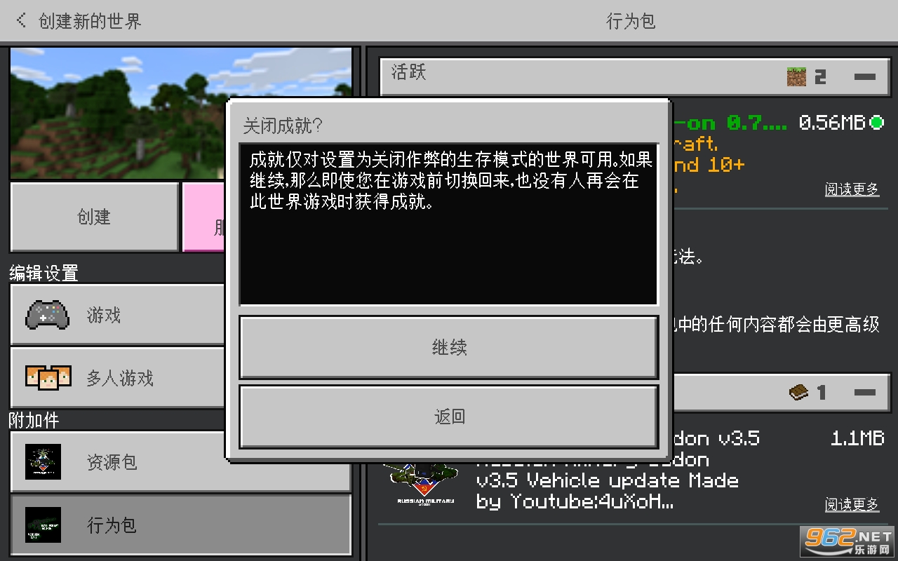 2、进入创建新世界界面,在左下角-附加件-点击“资源包”、“行为包”,在右边“我的包”点击模组图标-分别“激活”资源包与行为包