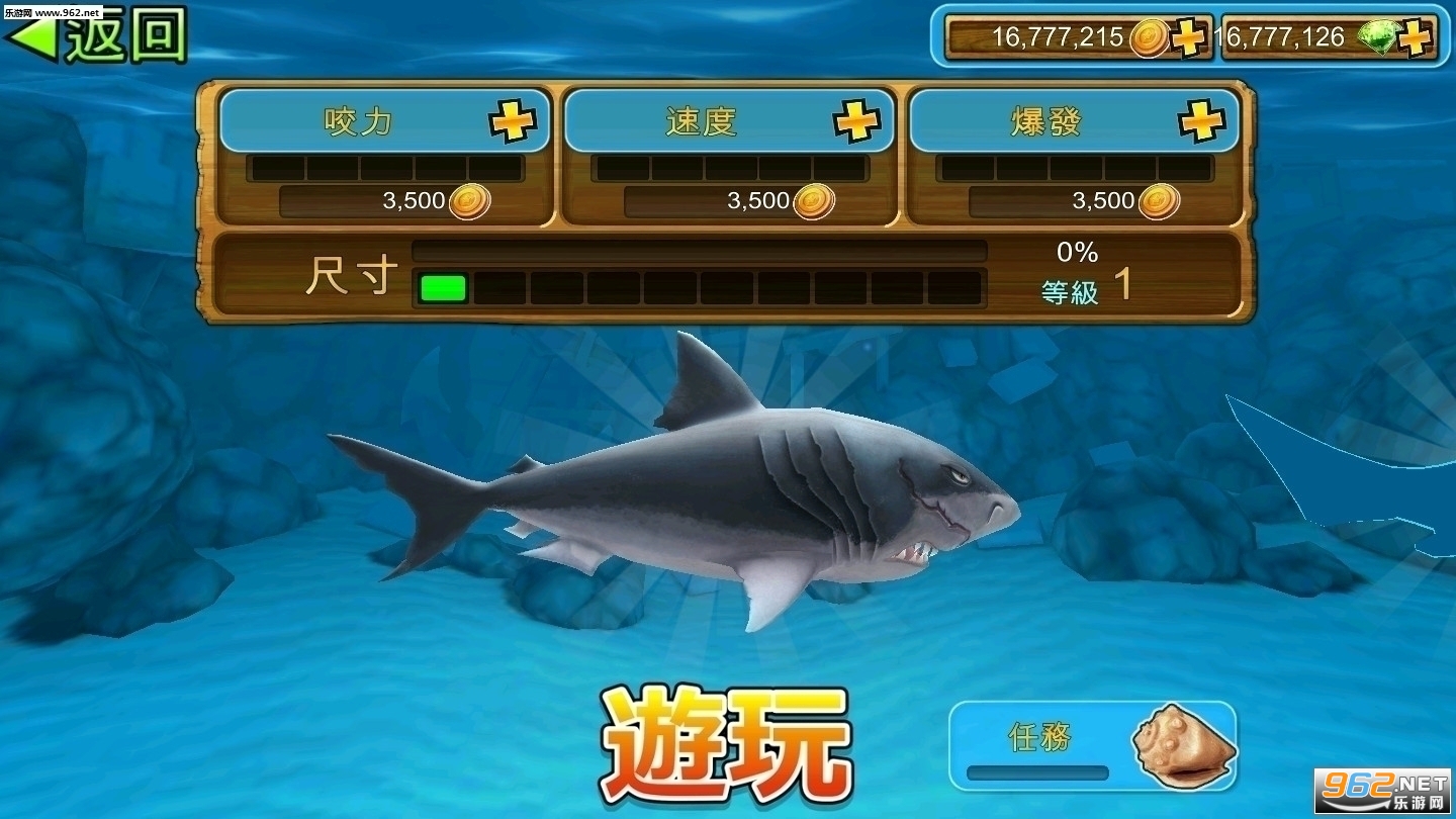 完成50个任务,寻找宝物取得金币与宝石,用来升级你的鲨鱼或者购买特殊救生道具。