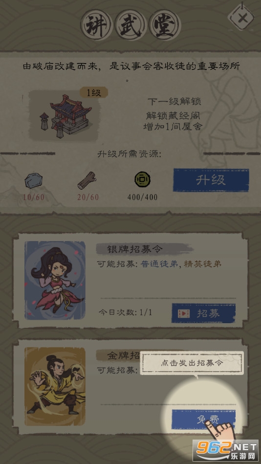 趣味的经营养成游戏,玩家需要一点点的建造自己的门派,招募各种弟子,提高威望,小编带来的是最强门派破解版,有着无限金币和食物,喜欢的朋友可以下载试试。