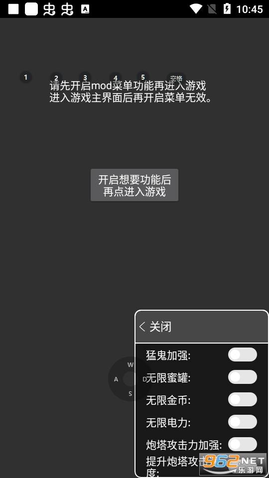 猛鬼加强,无限蜜罐、金币、电力,炮塔攻击力,提升炮塔攻击速度,猛鬼狂暴,加快猛鬼进场,维修无CD,免广告获得奖励。