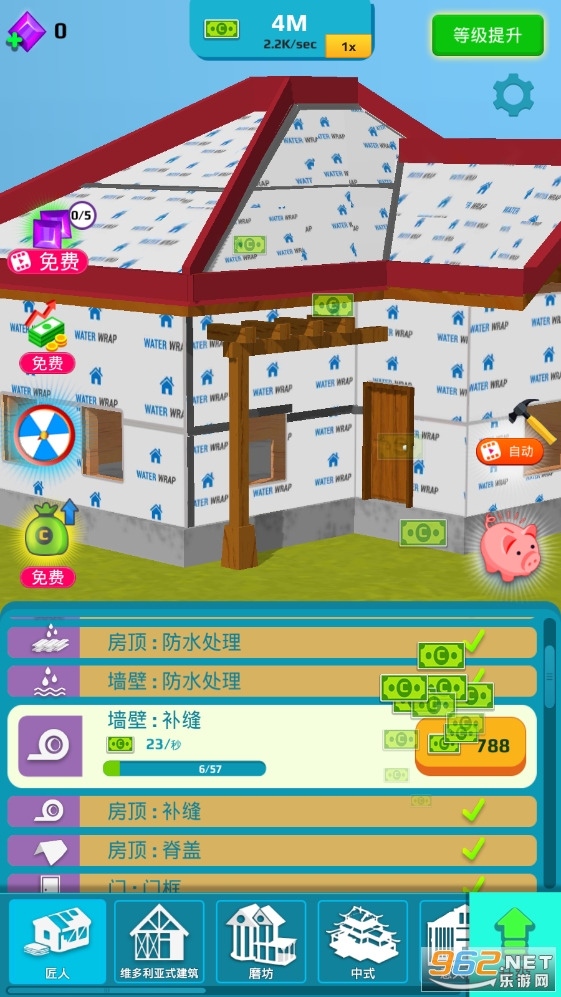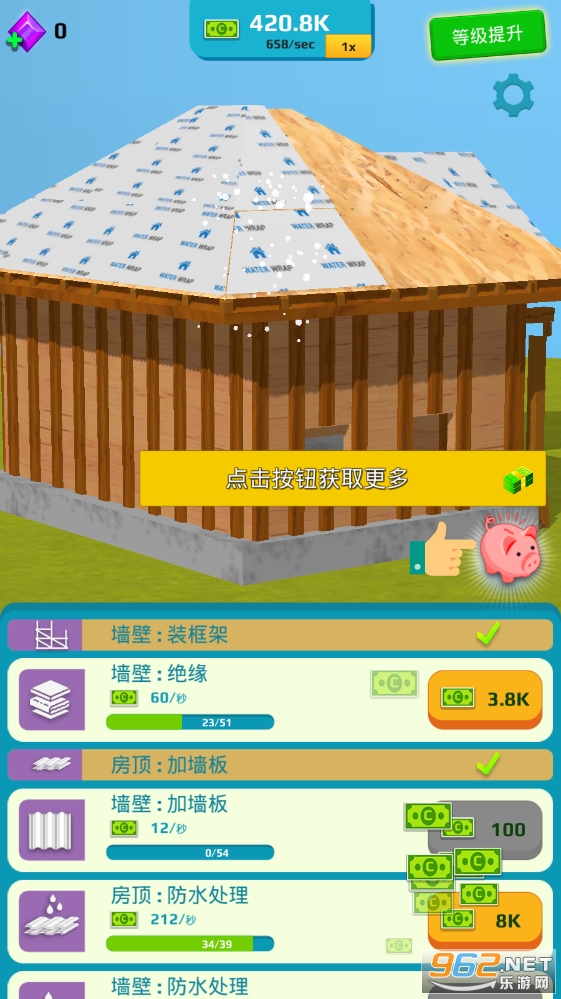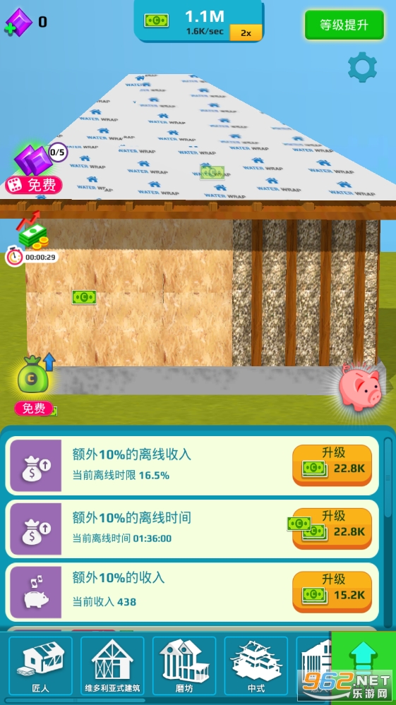 《放置家园》是一款竖版点击式休闲放置游戏,简单的游戏操作,熟悉的放置玩法,玩家在游戏中可以不断地点击升级房屋,墙壁、房顶装框架,绝缘,加墙板,进行防水处理,补缝,加门框等等,打造自己的小屋,还能解锁多利亚式建筑,磨坊,中式等不同风格的房子来装修,玩法多多!