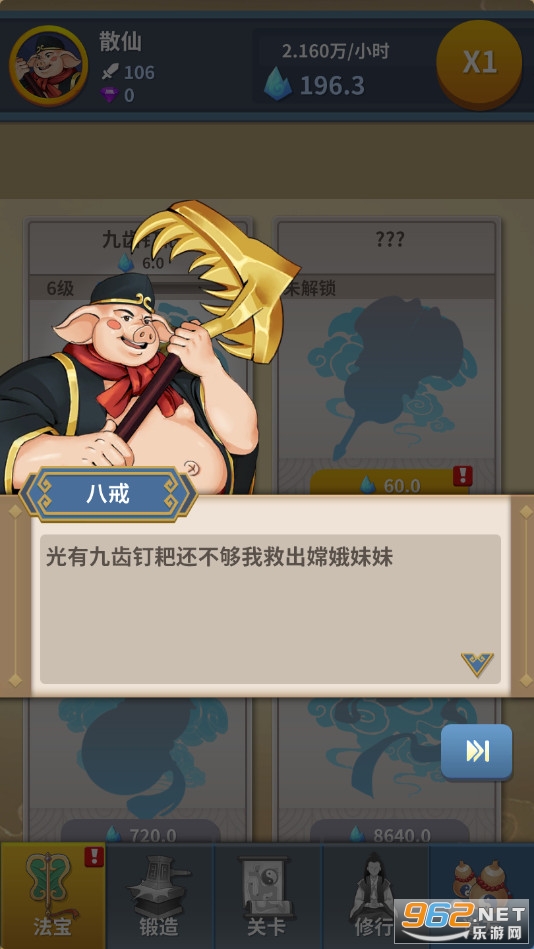 趣味的放置游戏,天蓬元帅被贬下凡投成猪胎,嫦娥被关百年,愤怒的猪八戒开始了艰苦的修炼,打妖怪,收集法宝,不断的提升实力,最后大闹天宫救出嫦娥,喜欢的朋友可以下载试试。