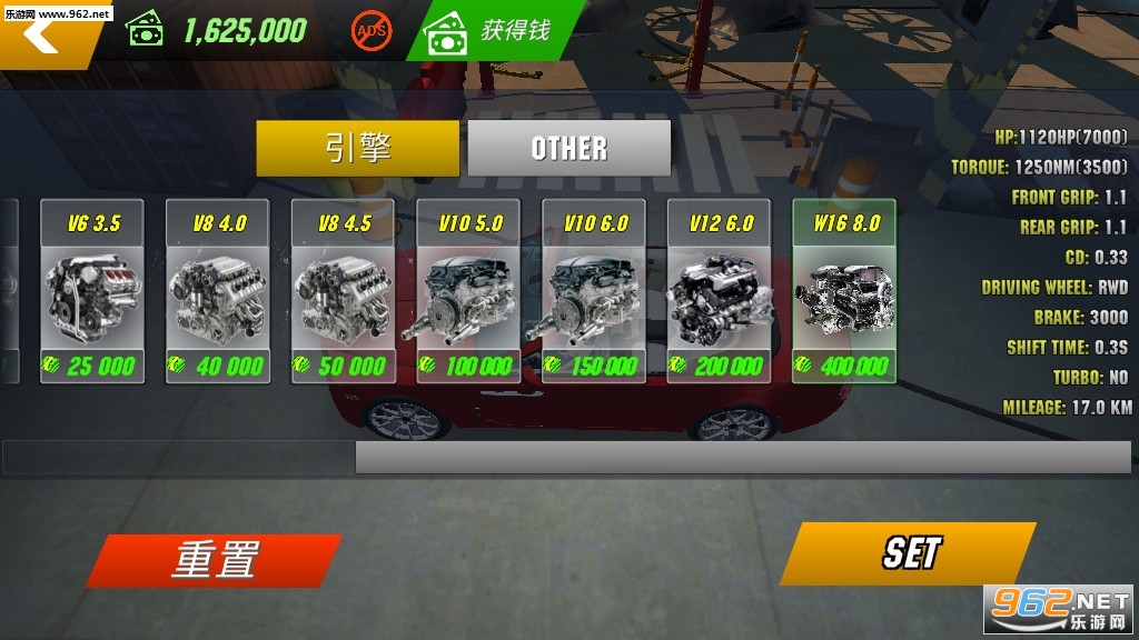 4、修改解锁付费W16引擎:选中此引擎点击图标 “UNLOCK FOR”即可解锁,解锁后可用游戏金钱购买。